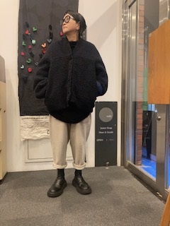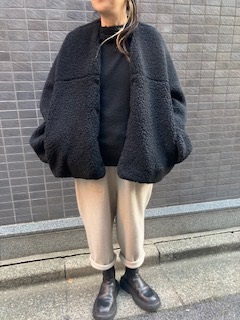 ネックがVなので襟が邪魔にならずマフラーがしやすいのがポイント。